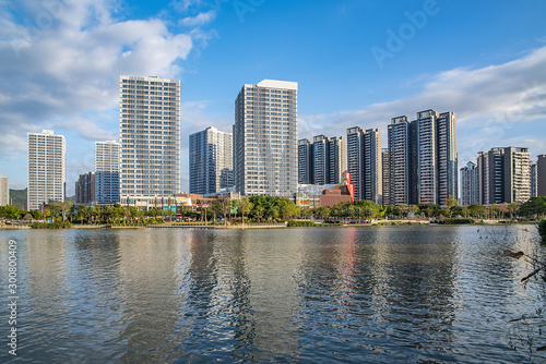 Skyline of the commercial center of Jiaomen River in Nansha District, Guangzhou, China