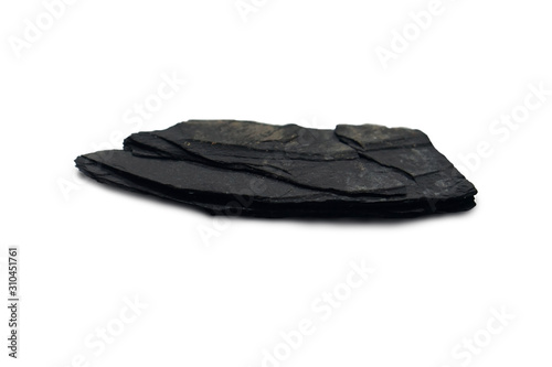 slate rock isolated on white background. There is noise and grain caused by the texture of the stone. Slate is a foliated metamorphic rock that forms from the metamorphism of shale.