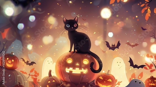 Sleek Black Cat Perched on Pumpkin Amidst Halloween Decorations of Ghosts, Bats, and a Glowing Jack-o'-lantern with a Mystical Soft Focus Background