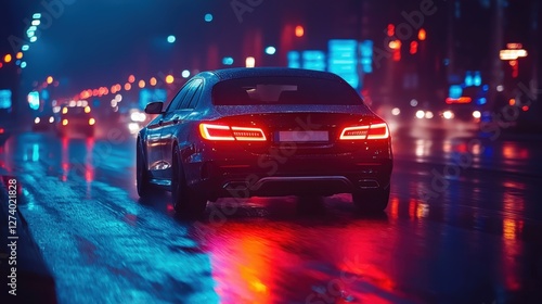 Sleek Black Luxury Car Driving at Night in Rainy Cityscape