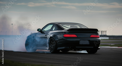 Sleek black sports car drifting on track, creating smoke and motion blur at sunset