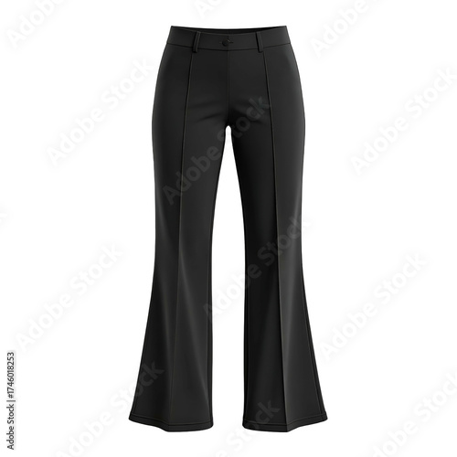 Sleek black trousers with a flared leg and center seam, button closure, on black backdrop