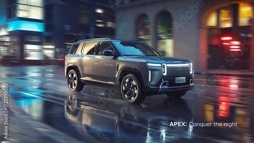 Sleek electric SUV drives through a wet city street at night with glowing headlights.