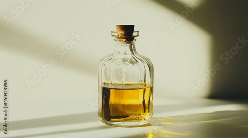 Sleek glass bottle with golden liquid placed on white surface, symbolizing weight loss medication, health supplement or detox drink concept. Minimalist and modern packaging design for wellness product