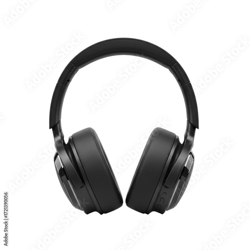 Sleek matte black over-ear headphones, plush earpads, front view, isolated on transparent background with copy space, high-end audio technology concept
