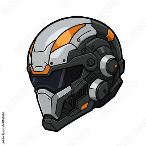 Sleek, metallic, futuristic helmet. Gray, orange, and black details. Bold linework present