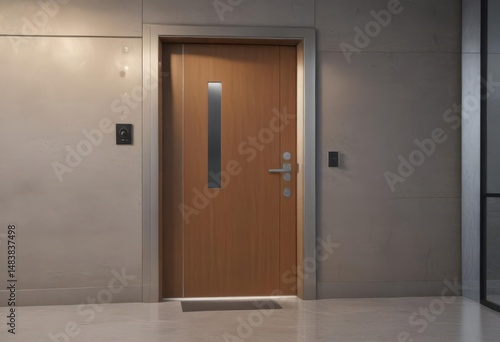 Sleek minimalist lobby door with modern service bell , button, push, architecture