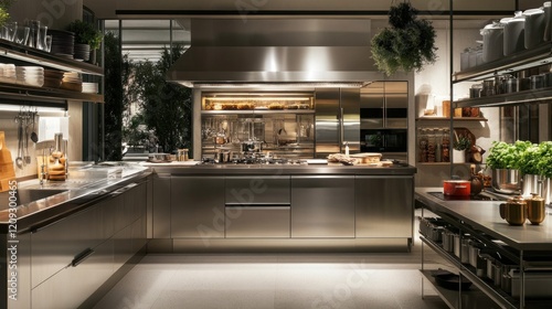Sleek Modern Kitchen with Stainless Steel Appliances and Warm Lighting