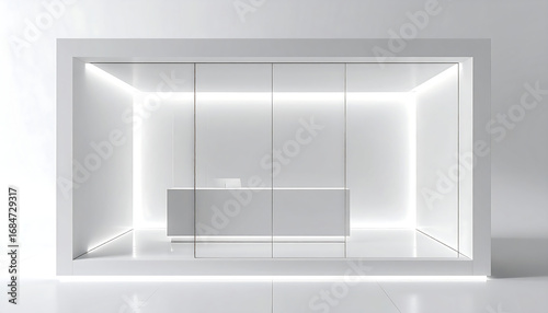 Sleek modern reception desk glowing with ambient light, creating a clean, professional, and welcoming atmosphere