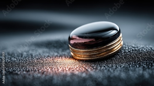 Sleek oval-shaped glossy dark object with golden rings on textured glittering black background, elegant luxury design with warm glowing reflections, high-end polished aesthetic featuring striking cont