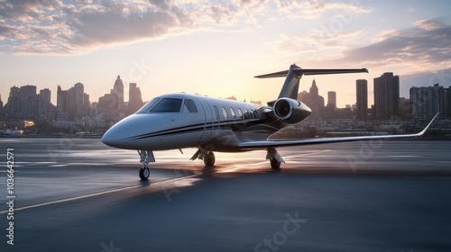 Sleek Private Jet at Sunset, Luxury Travel Against a Stunning City Skyline Background