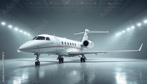Sleek private jet in a spacious hangar, perfect for a high-end advertisement setting.