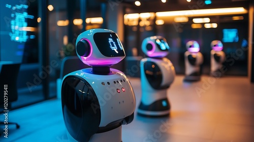 Sleek robots stand silently in vibrant blue light modern office. AI Generated
