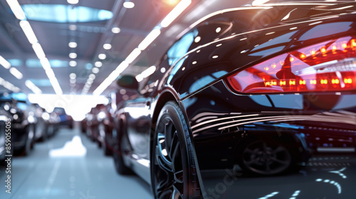 Sleek, shiny sports cars line up under bright lights in a modern showroom, reflecting luxury and high performance.