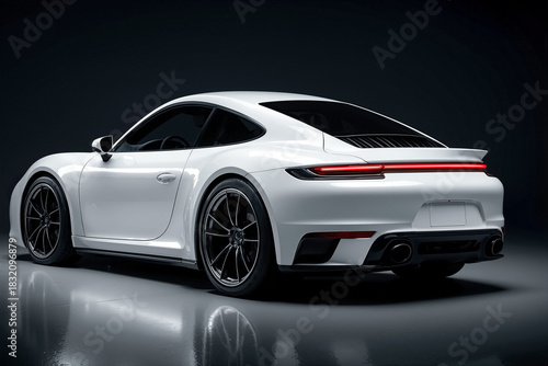 Sleek sports car with a glossy white finish and aerodynamic design, showcasing modern engineering and luxury aesthetics in a dramatic lighting environment