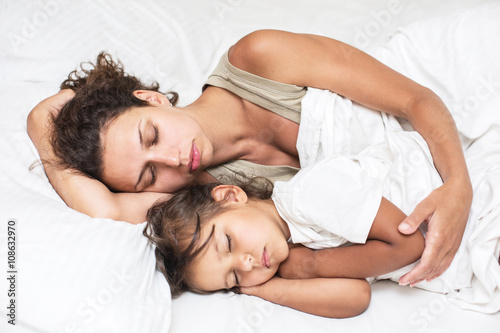 Sleeping kid girl and her mother in the bed.