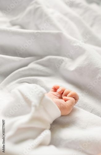 Sleeping newborn baby in a wrap on white blanket. Beautiful portrait of little child girl, one week old.