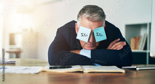 Sleeping, sticky notes and eyes of business man with tired, burnout and fatigue of a mature professional in office. Paper, mental health and entrepreneur with nap and corporate break at a company