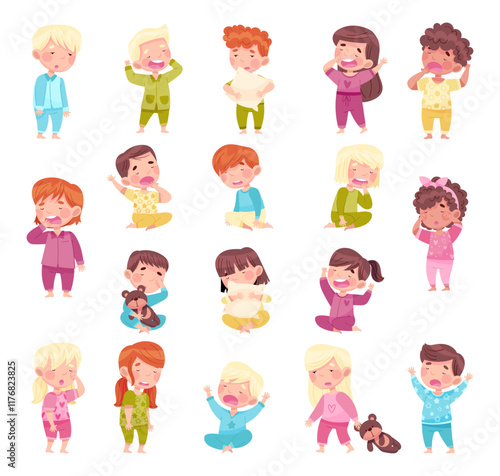Sleepy Little Boy and Girl Wearing Pajamas Get Ready to Bed Vector Set
