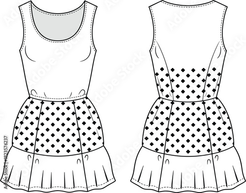 Sleeveless panel dress sketch, scoop neckline, patterned and solid skirt panels, front and back view, CAD vector fashion template