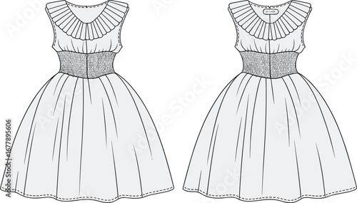 Sleeveless, pleated, collar, gathered, waist, summer, dress, with, flared, skirt, front, and, back, technical, fashion, sketch, flat, vector, illustration, template