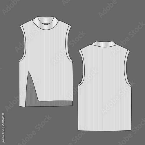 Sleeveless Ribbed Top Front Slit High Low Hem Crew Neck Sleeveless Rib Clothing Fashion flat sketch drawing template design vector