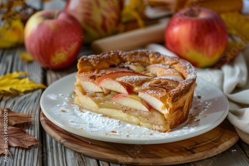 Slice of apple pie dusted with powdered sugar on white plate with autumnal background