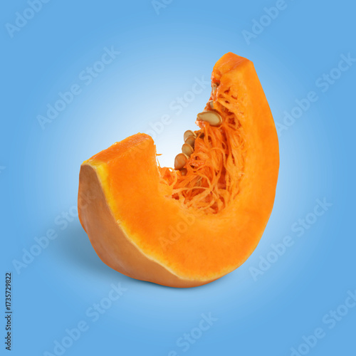 Slice of ripe pumpkin on blue background. Fall vegetable