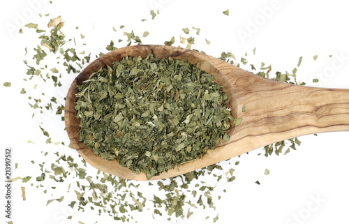 Sliced and cut dry celery leaves pile in wooden spoon, isolated on white background, top view