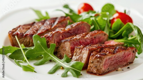Sliced beef steak with a side of greens on a white plate, isolated on white