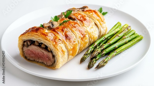Sliced Beef Wellington with mushrooms and asparagus on white plate. Gourmet presentation of classic dish.