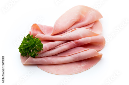Sliced boiled ham sausage isolated on white background, top view.