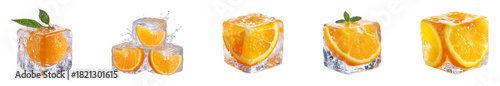 Slices of orange in ice cube isolated.