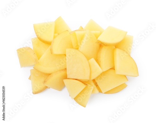 Slices of raw potatoes isolated on white, top view