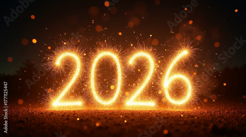 Сlose-up of golden fireworks bursting in the dark night sky, creating sparkling numerals "2026" with glowing particles, vivid light trails, and realistic smoke texture
