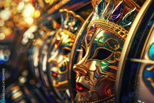 Slot machines with gold and silver masks in front of a bright blue background at the casino