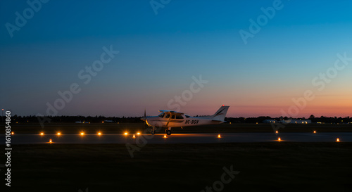 Small airplane illuminated on the runway at dusk ready for takeoff flight