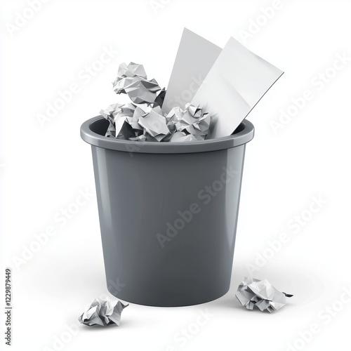 small desk trash bin in gray with crumpled paper spilling out, placed on a bright white background