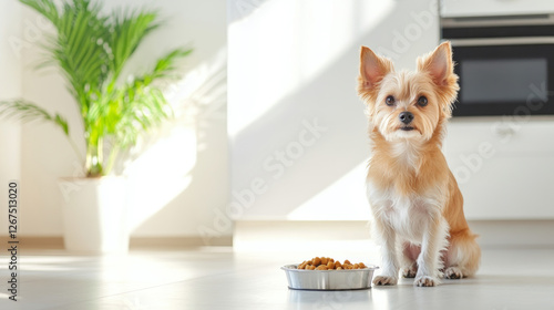 Small dog patiently waiting by a food bowl in a modern kitchen with sleek white decor and soft natural light
