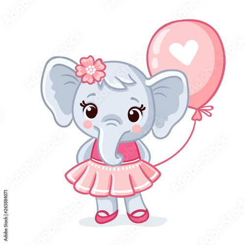 Small elephant stands in a beautiful pink dress on a white background.