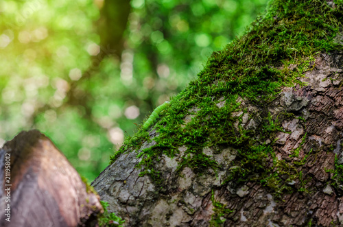 small green caterpillar crawls along the tree