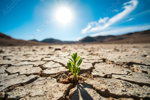 Small green sprout breaks through the cracked earth of an arid landscape under a bright blue sky with the sun shining down. The plant’s green leaves stand out against the dry, barren land.
