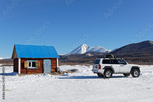 Small house and a car in a mongolian winter landscape
