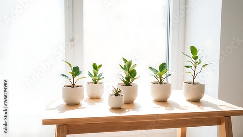 Small Indoor Plants by Sunny Window on Wooden Table