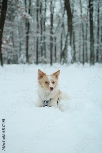 Small light dog lies in snowy forest