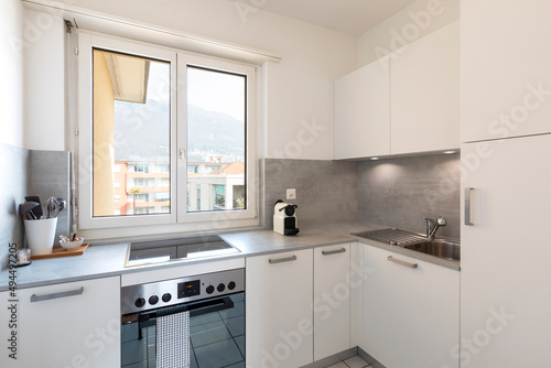 Small modern white kitchen with oven, sink, coffee maker and stove with large bright window with a view
