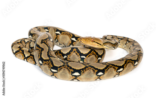 Small Snake Reticulated Python - Malayopython reticulatus coiled up and ready to attack isolated on white background.