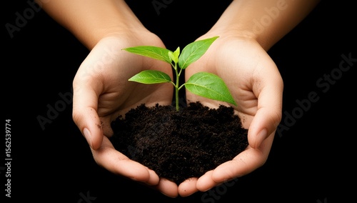 Small sprout held gently in cupped hands. Dark soil