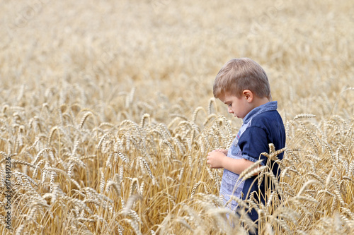 Small very handsome , cute, clever, well- mannered blond boy walks in the field and is looking for something