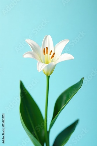 Small White Lily with dark green leaves on a pale blue sky background, flowers, leaves